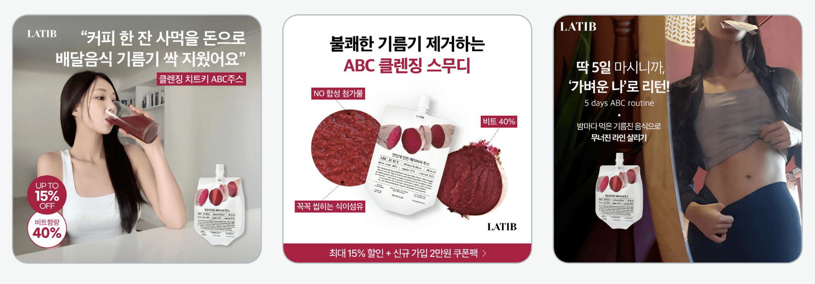 예를 들어 아래 세 가지 소재는 모두 같은 제품(ABC 클렌징 스무디)을 광고했지만, CTR과 ROAS는 각각 크게 달랐습니다.