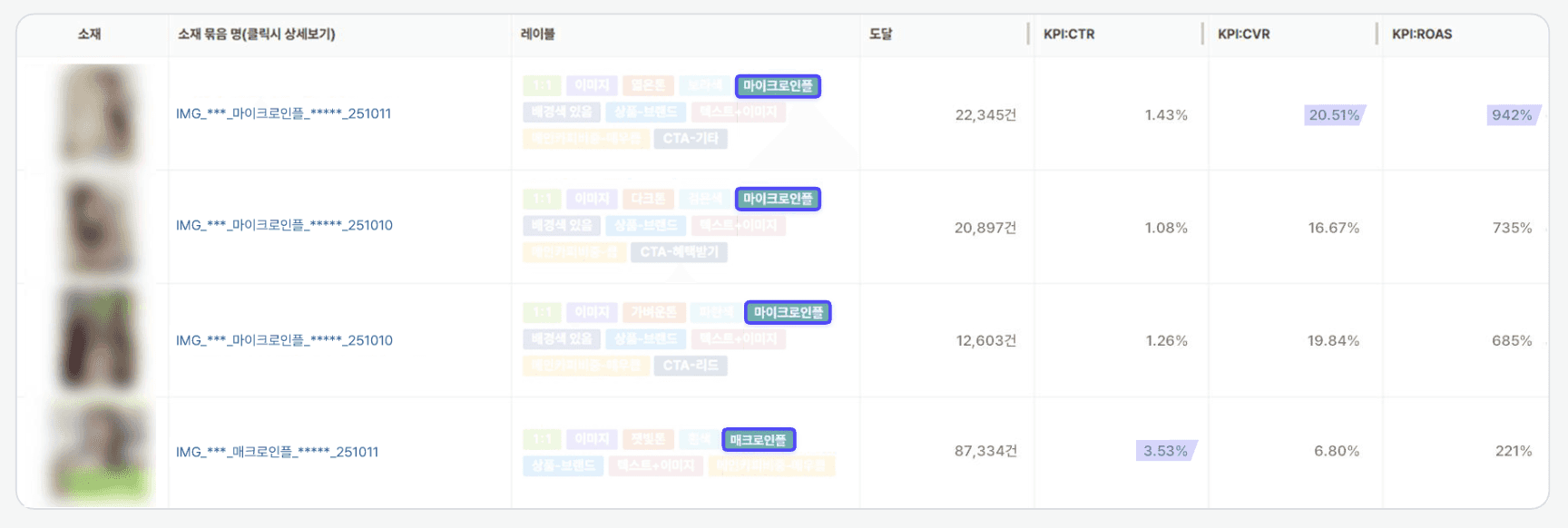 이번에는 실제 캠페인에서 집행된 광고 소재 데이터를 기반으로 이러한 요소들이 어떻게 성과로 이어졌는지 살펴보겠습니다.