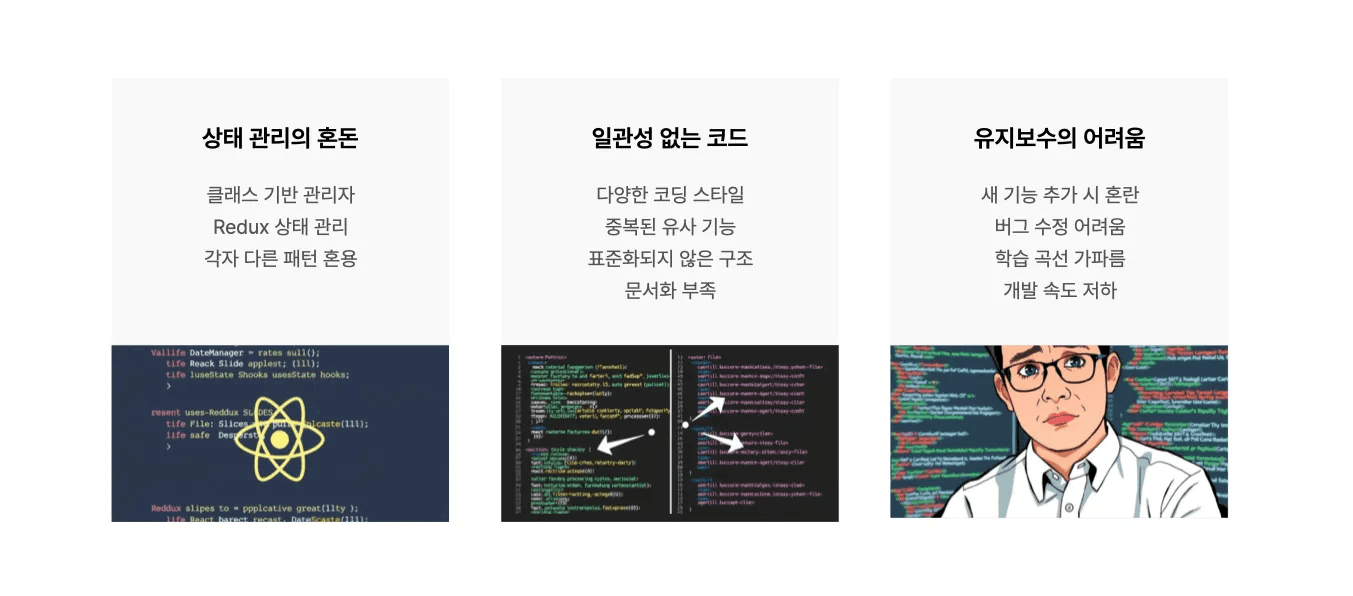 이 모든 요소가 맞물리면서 유지보수는 어렵고, 새 기능을 추가할 때마다 예기치 않은 오류가 발생했습니다.