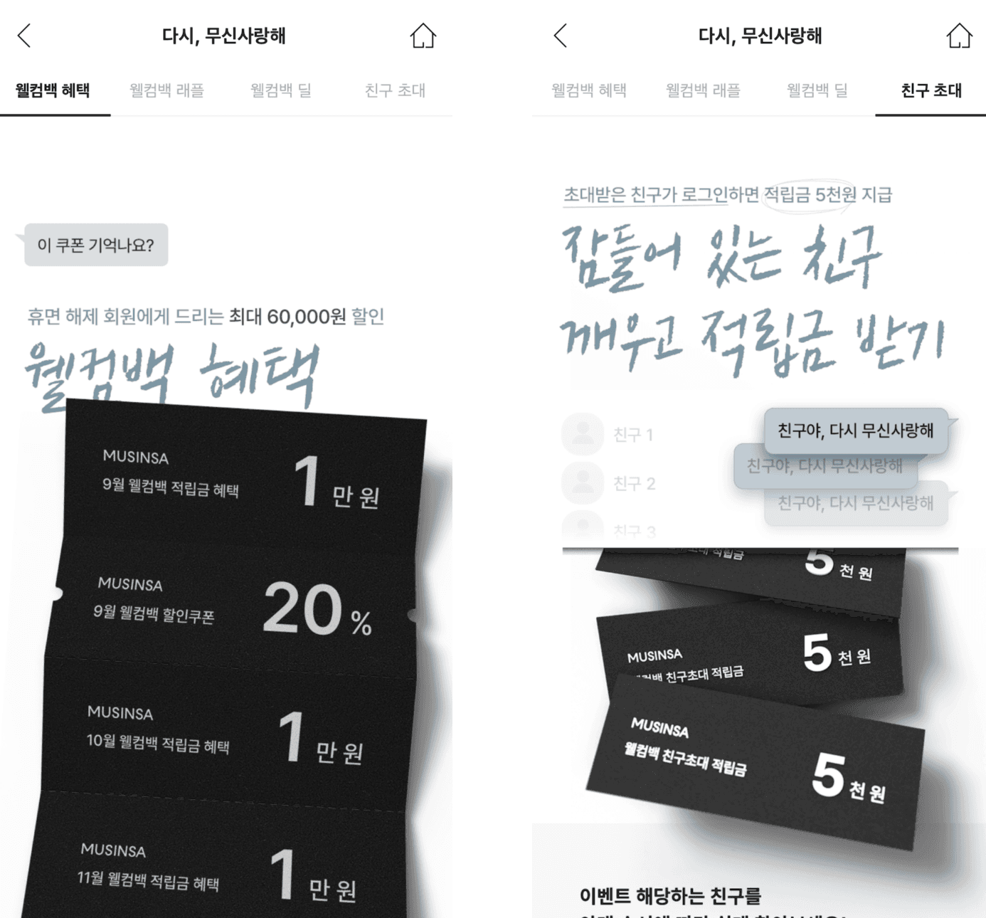 무신사는 ‘다시, 무신사랑해’라는 타이틀로 웰컴백 혜택을 지급했어요. 재방문 고객에게는 적립금, 할인 쿠폰을 지급하고 휴면 회원인 친구를 초대하는 경우 적립금 5천원을 더 지급하는 친구 초대 이벤트도 함께 실시했어요. 그 외에도 휴면 회원에게만 래플 응모 기회를 주기도 했어요.