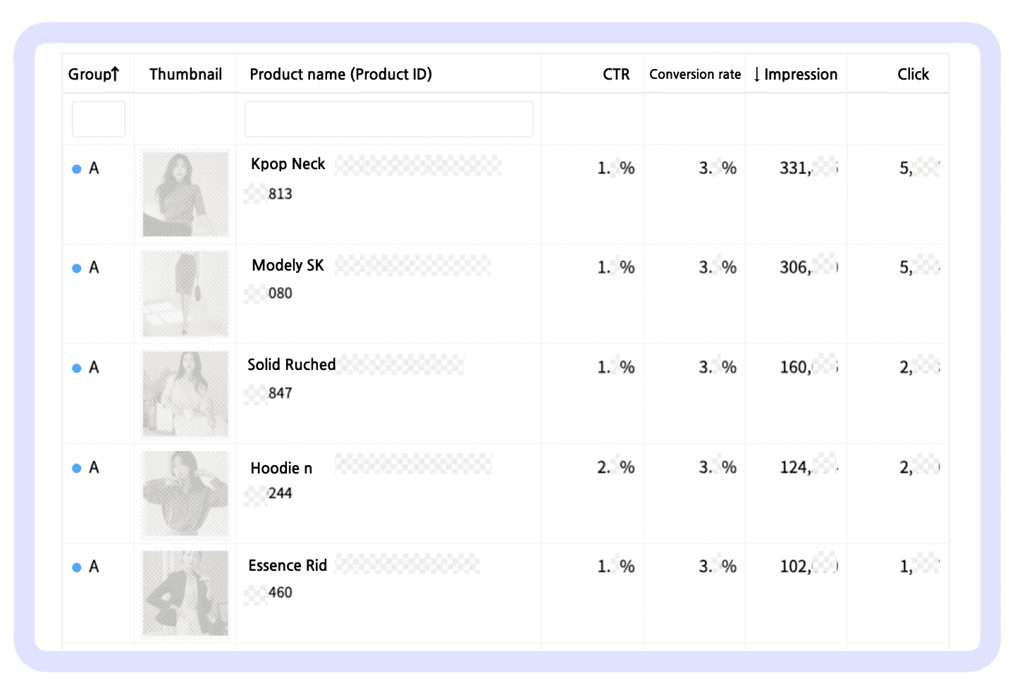 If you want to identify the best products among all? → Look for products that have a high conversion rate compared to the impression frequency to customers. Datarize classifies such products under Group A in the product report provided to users. If an item from Group A has a relatively lower impression, placing it in a more prominent position could significantly boost sales.