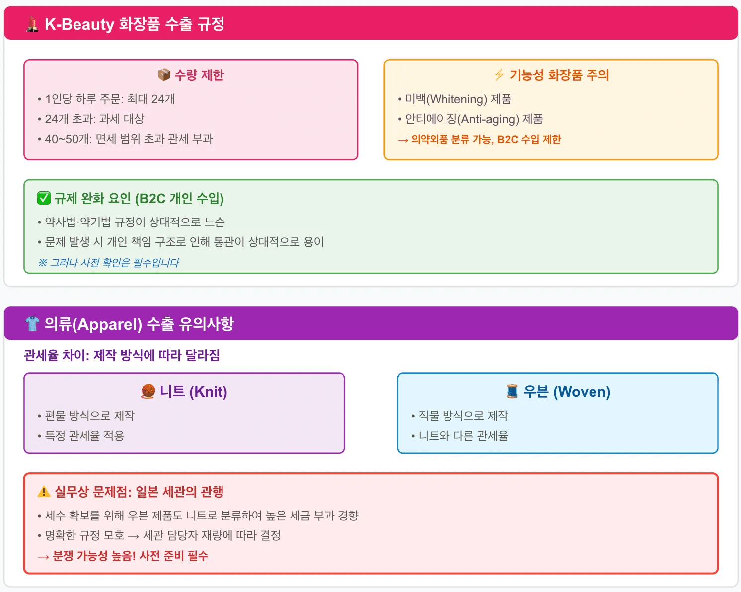 ✔️ 목표 품목의 일본 통관 규정 확인 (화장품 24개 제한, 기능성 화장품 규제 등)