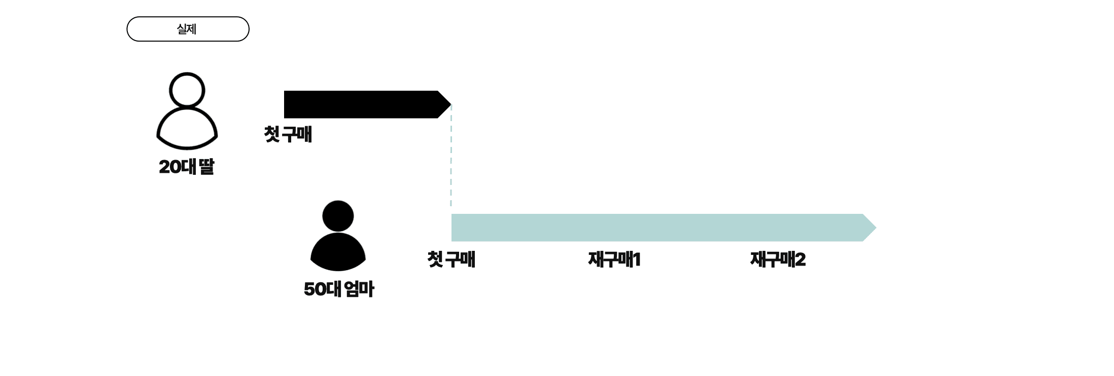 생활용품이다 보니 20대 딸이 첫구매를 하고 재구매를 할 때는 50대인 엄마의 계정을 이용할 때가 많았습니다. 딸이 좋은 상품을 찾아 첫구매 후 가족들에게 공유하면 엄마는 재사용을 위해 같은 상품을 결제하는 일이 잦았기 때문입니다. 또한, 엄마 계정을 새롭게 만들어 첫구매 할인을 받고 재구매하는 경우도 많았습니다. 이 경우 트래커 데이터에서 첫구매 이벤트가 2개로 보여지더라도 첫구매는 1개나 다름없었던 것인데요. LTV 계산이 잘못되었다고 볼 수 있죠.