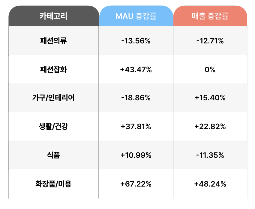 반면, 화장품/미용, 생활/건강 카테고리는 눈에 띄는 반등세를 보였고, 가구/인테리어와 패션잡화도 MAU나 매출 지표에서는 긍정적인 흐름을 기록했습니다. 해당 카테고리에서 소비자 니즈에 맞춘 적극적인 마케팅 전략과 리텐션 관리가 긍정적인 효과를 냈던 것으로 추정할 수 있어요.