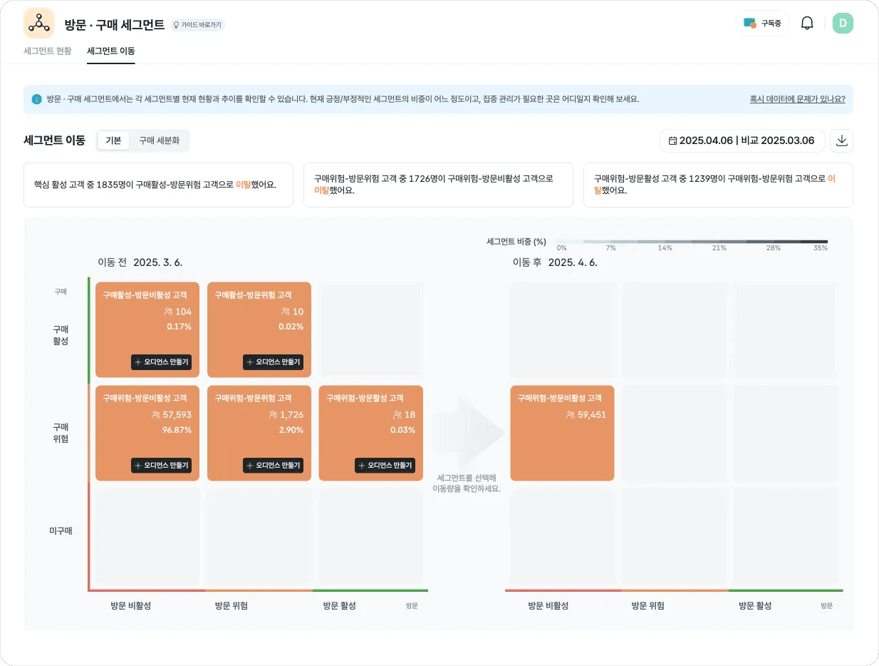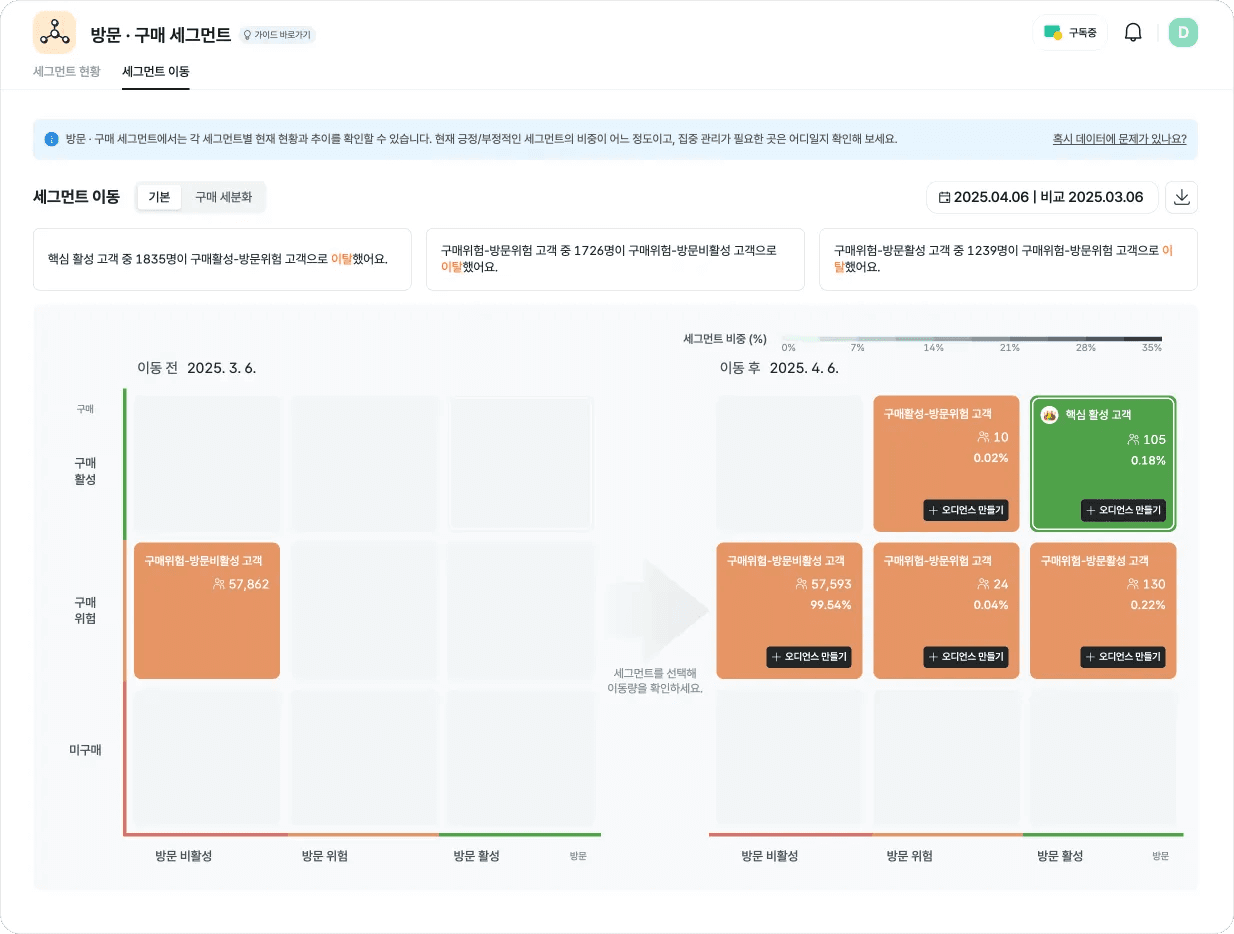 이를 통해 ‘구매위험-방문위험’ 세그먼트에 있던 고객들이 방문이 줄어들며 ‘방문비활성’으로 전환된 흐름을 쉽게 확인할 수 있고, 마지막으로 이동 전/후의 세그먼트를 클릭하면 각각 이동한 고객들에 대해서 캠페인을 집행할 수 있도록 오디언스 생성이 가능합니다.