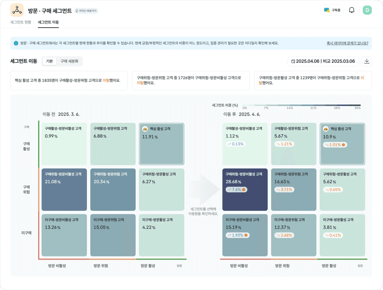 구매 세분화 모드에서 첫구매 - 재구매 세그먼트의 이동도 살펴보세요. 또한 구매 세분화 모드에서는 ‘첫구매 → 재구매’ 세그먼트 이동을 함께 살펴보는 것이 좋습니다. 첫구매 후 재구매로 이어지지 않고 ‘첫구매-방문위험’으로 이동하는 비율이 높다면, 리텐션 관리가 충분히 이루어지지 않고 있을 수 있습니다. 첫구매 고객에게 재구매를 유도할 충분한 혜택이 제공되고 있는지 점검해보세요.