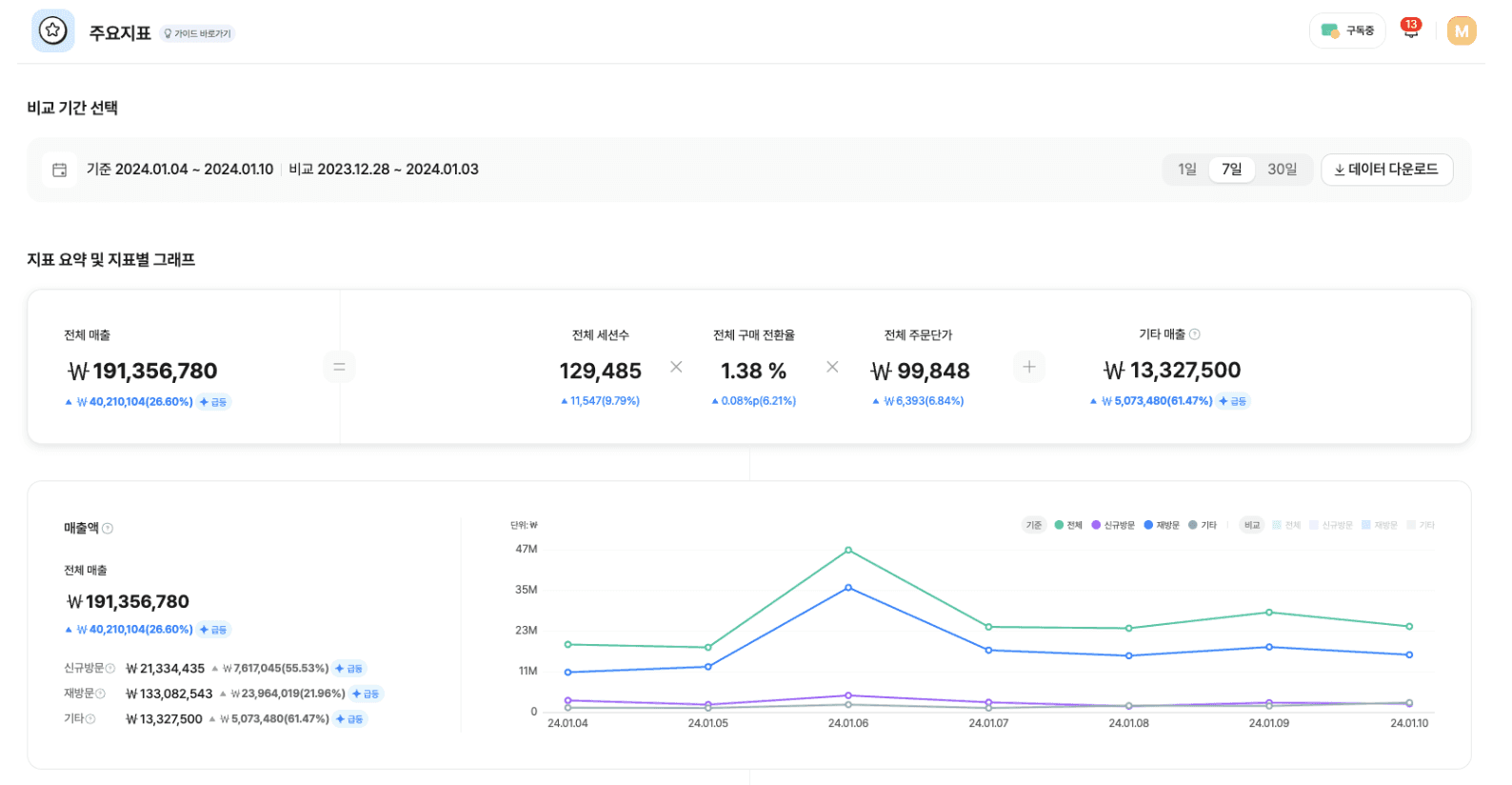 원하는 기간별로 매출과 매출을 구성하는 필수 지표들의 차이도 비교할 수 있도록 구성되어 있는데요. 오늘 데이터 트렌드 리포트를 통해 카테고리별 전체적인 매출 흐름과 원인을 파악할 수 있었을 텐데요. 나아가 '방문자 수X구매전환율X객단가=매출' 공식을 적용해, 여러분의 쇼핑몰 매출을 체계적으로 분석해보세요. 이 공식을 통해 매출의 주요 원인을 파악하고 실질적인 개선 전략을 도출할 수 있습니다.