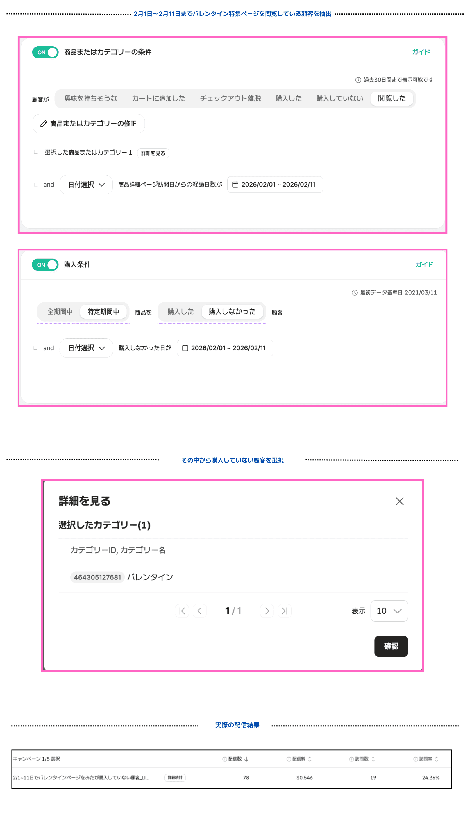 2回目:2月1日〜2月11日までバレンタイン特集ページを閲覧しているが購入していない人のセグメントを作成しクーポン使用期限のリマインド配信