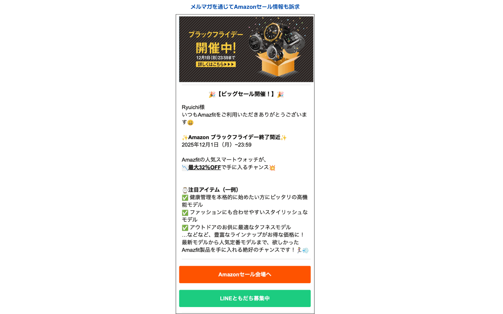 ブラックフライデーなどのタイミングで、メルマガを通じてAmazonセール情報を訴求することで、自社サイトだけでなくEC全体の売上向上に貢献しました。