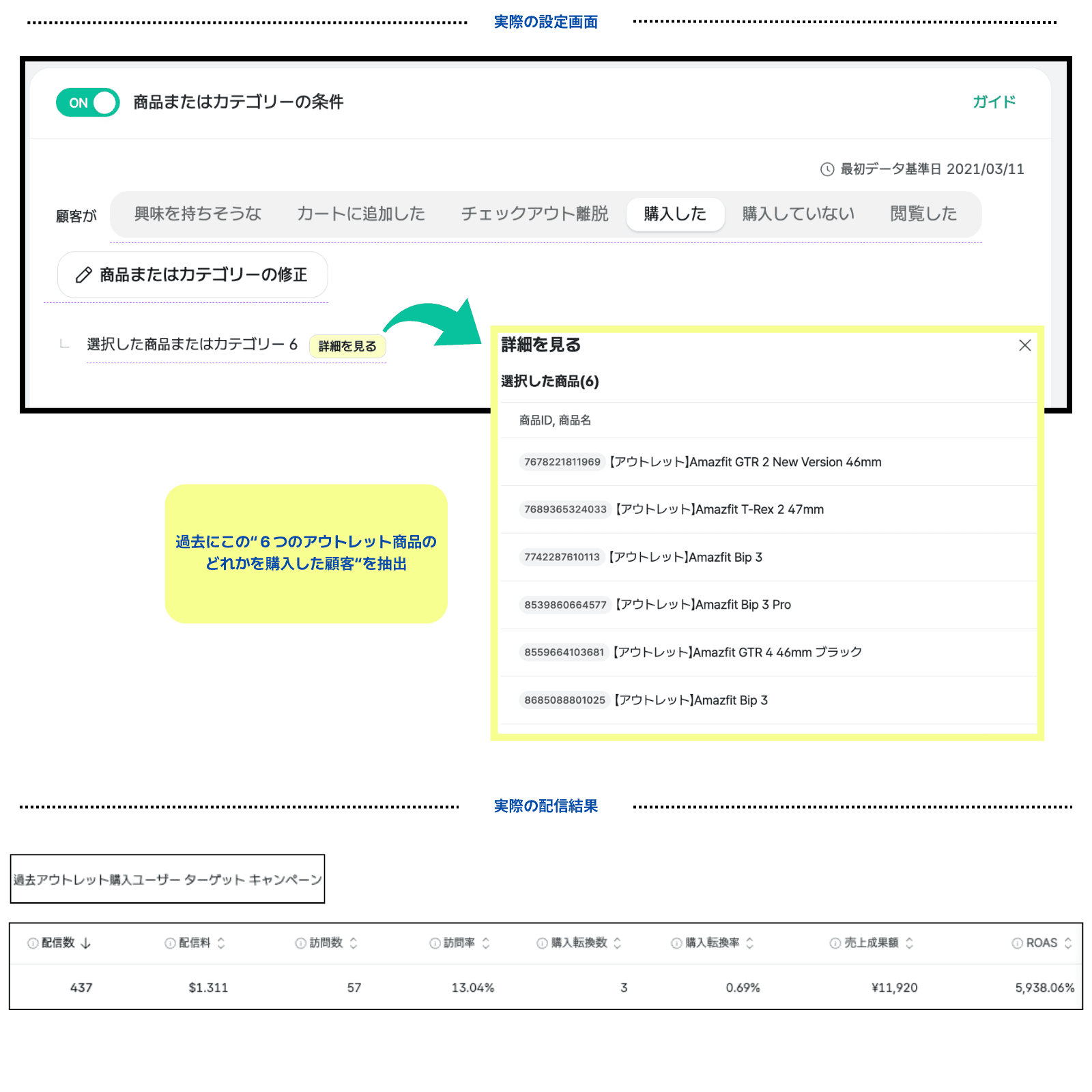 全体配信では訪問率は平均2〜3%でしたが、新しくアウトレット商品を販売する際に、過去アウトレット商品を購入したことがあるお客様だけを抽出してセグメント配信しました。