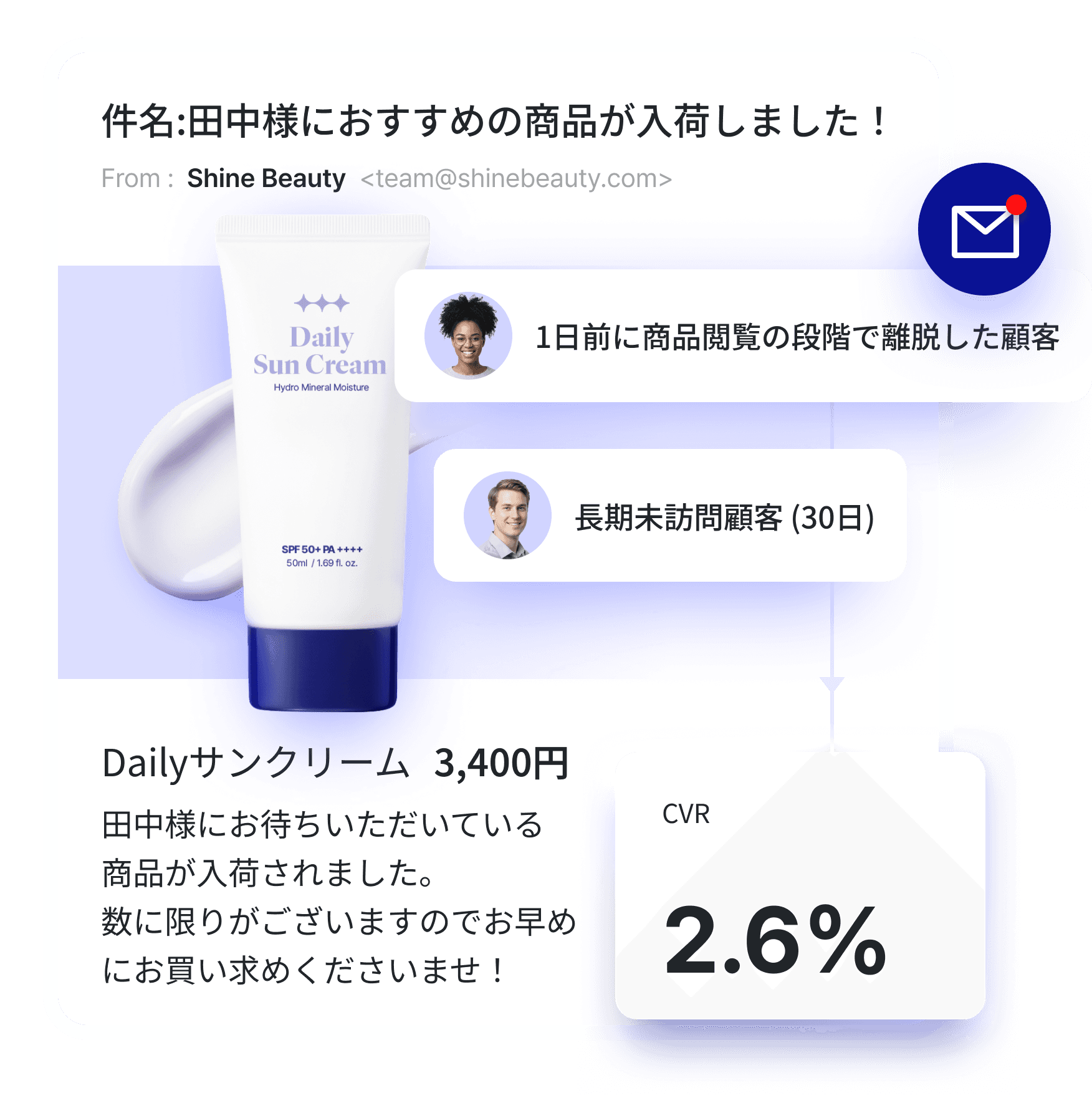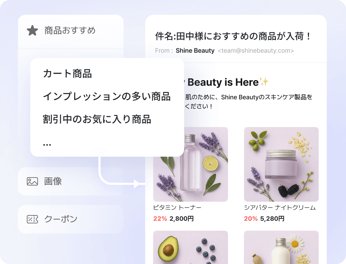 ノーコードで誰でも簡単に作成でき、直感的な操作でデザイン性の高いメールを配信できます。さらに、顧客の名前を自動挿入できるタグ機能や、興味に合わせておすすめ商品を自動掲載するパーソナライズ配信にも対応しており、配信するだけで「売れやすいメール」を実現できます。また、過去のメルマガをそのまま複製できるコピー機能により、毎回ゼロから作り直す必要がなく、運用時間を大幅に削減できる点も魅力です。