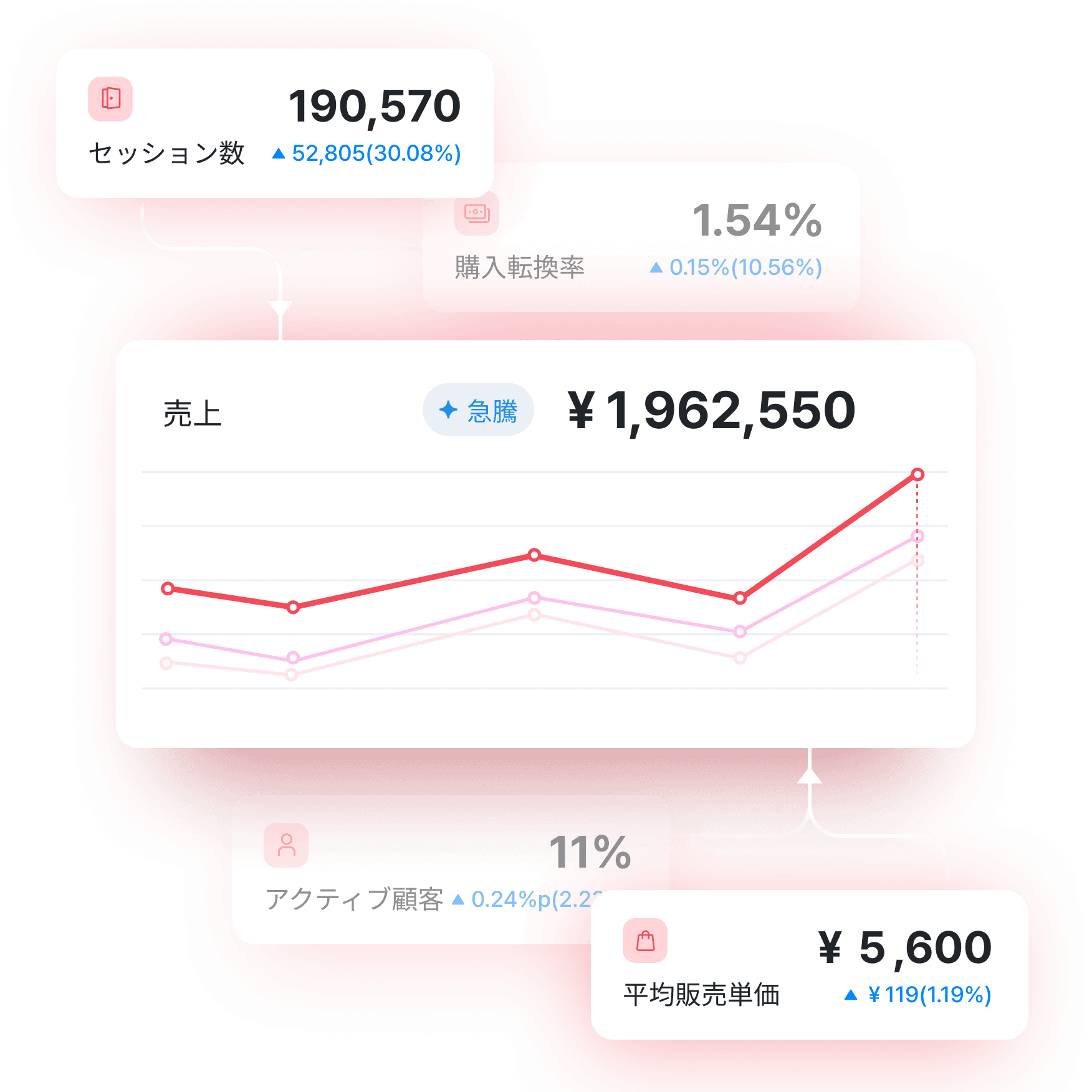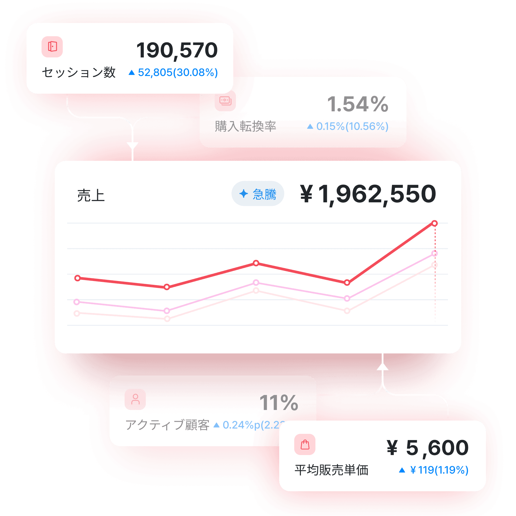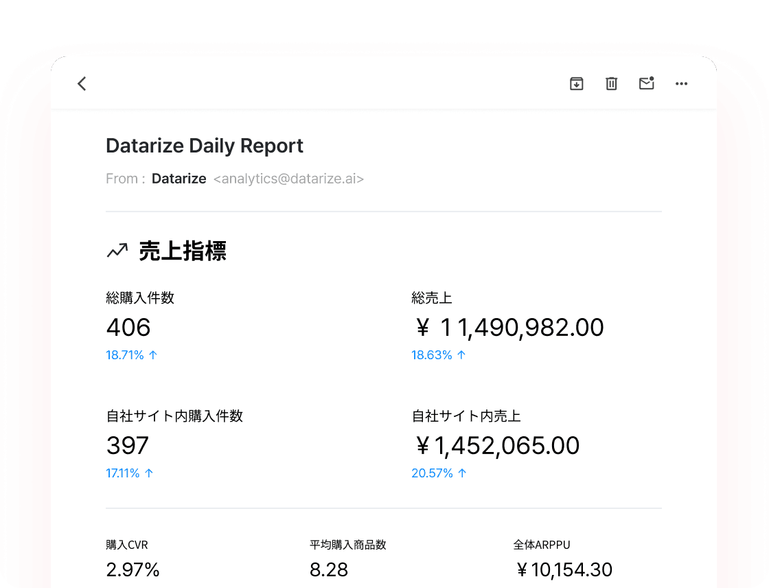 売上、セッション、購入転換率(CVR)、客単価(AOV)など ECサイトに必要な主要指標を、ひとつの画面に集約。サイト全体の状態を、素早く・正確に把握できます。