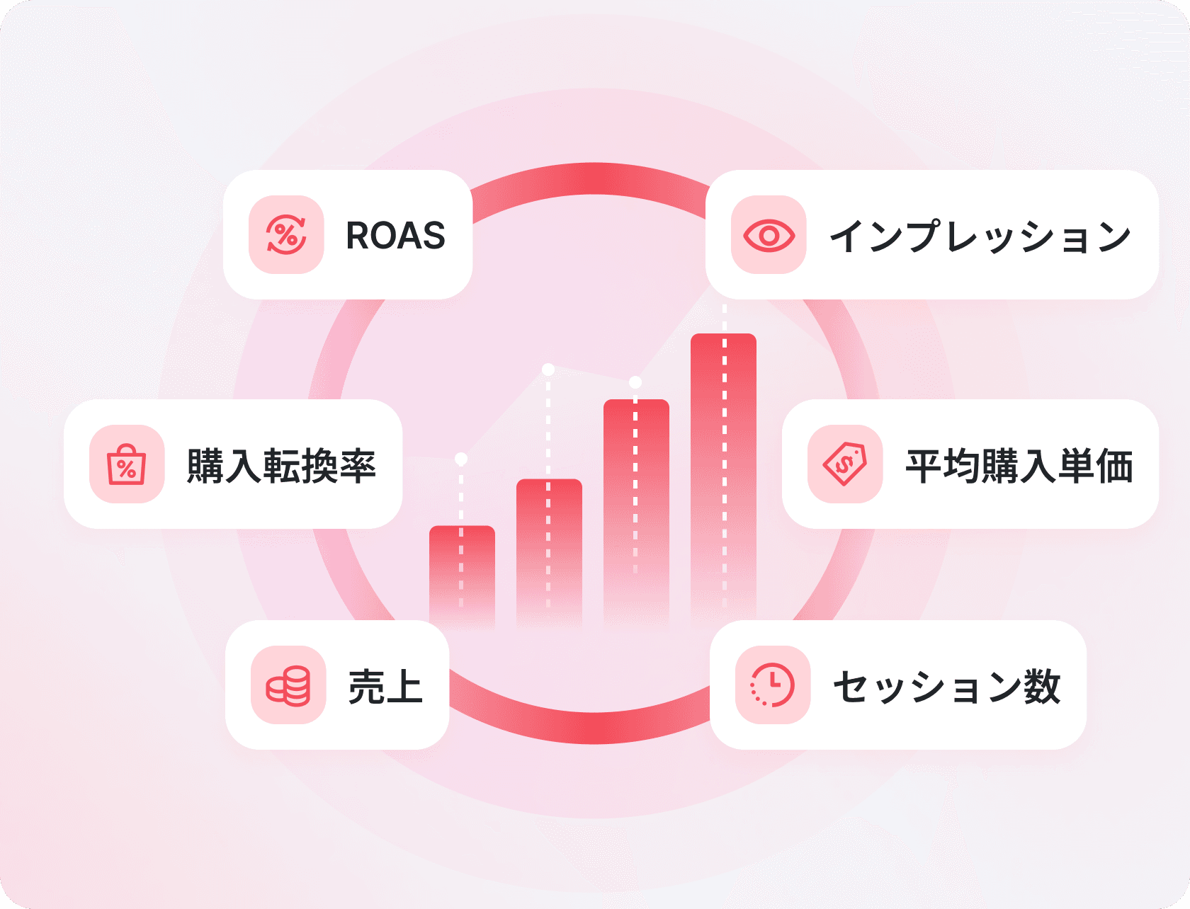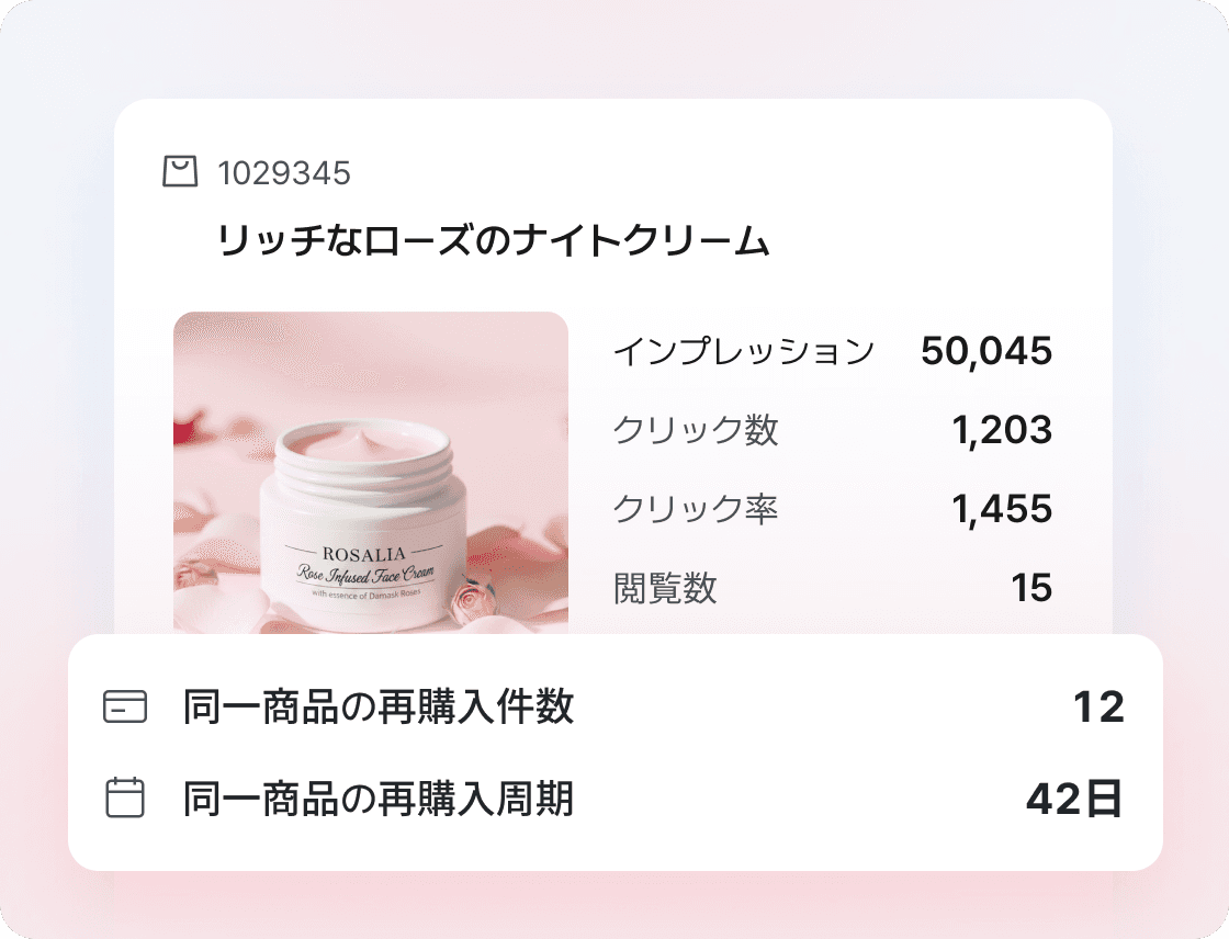 商品別のインプレッション・クリック・購入転換率・再購入率を分析。どの商品が本当に関心を集めリピートにつながっているか把握できます。