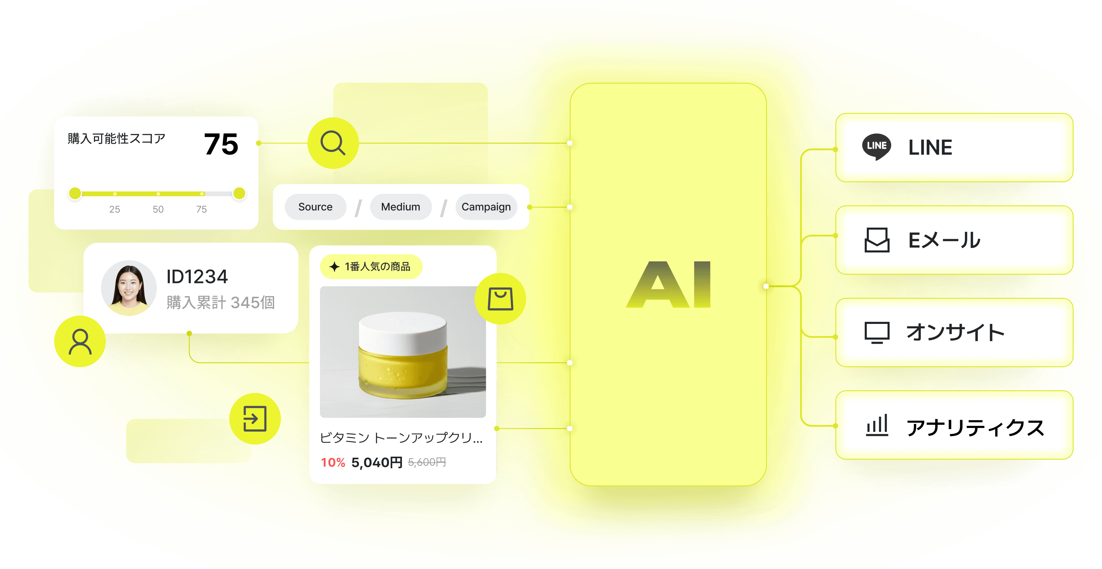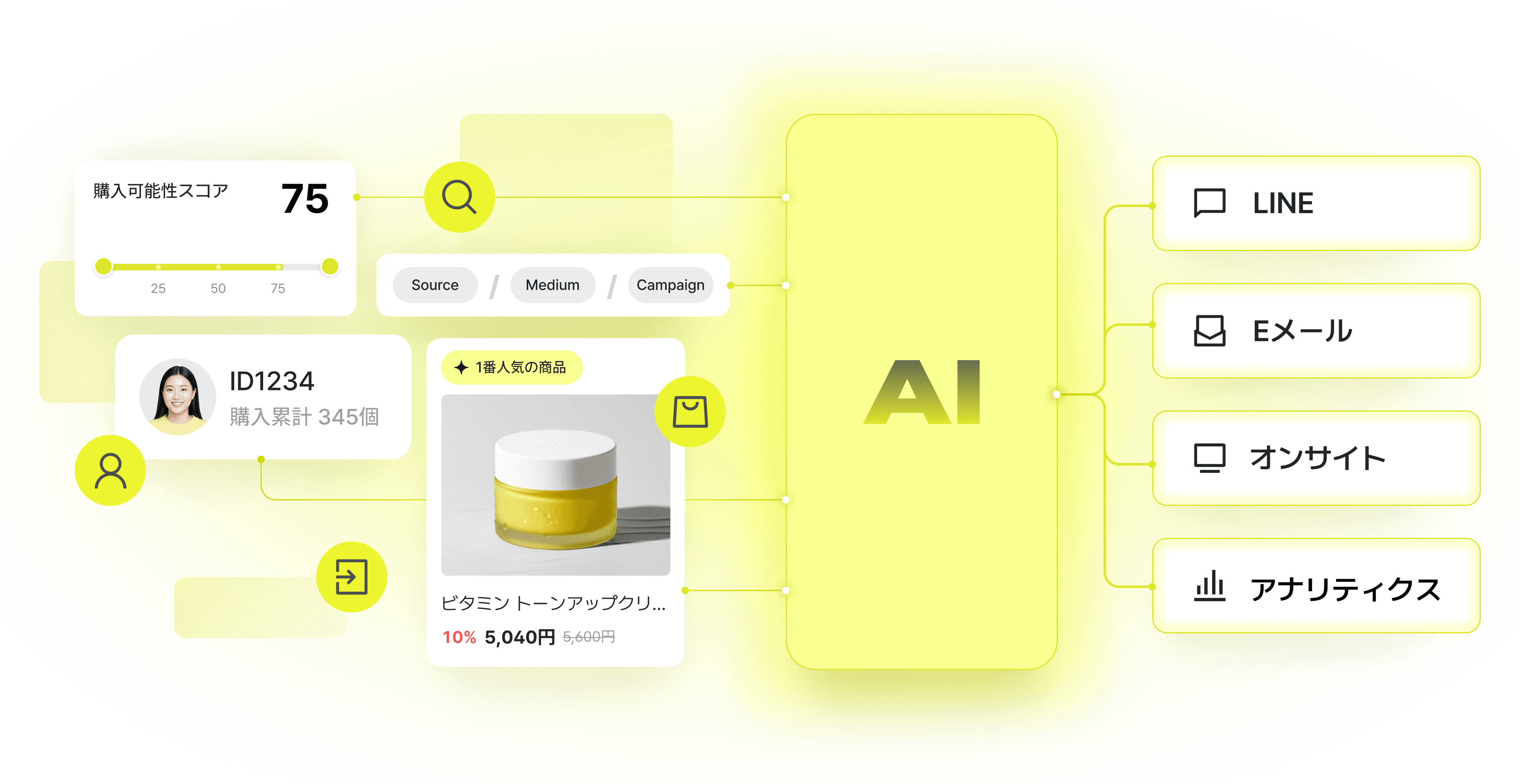 訪問者の行動データをもとに購買傾向を分析し購買確率を0〜100のスコアで可視化します。 購入見込みの高い顧客を特定し、 最適なマーケティング施策を実施できます。