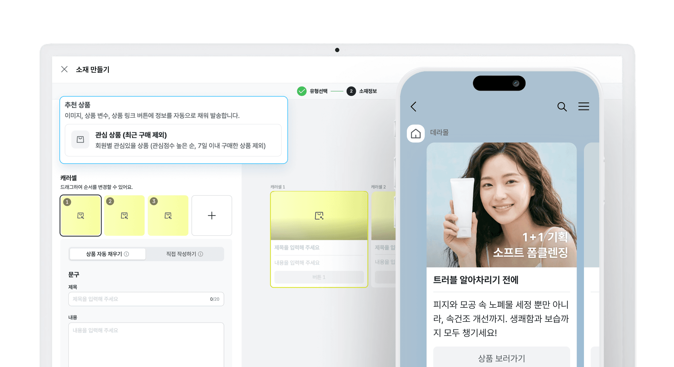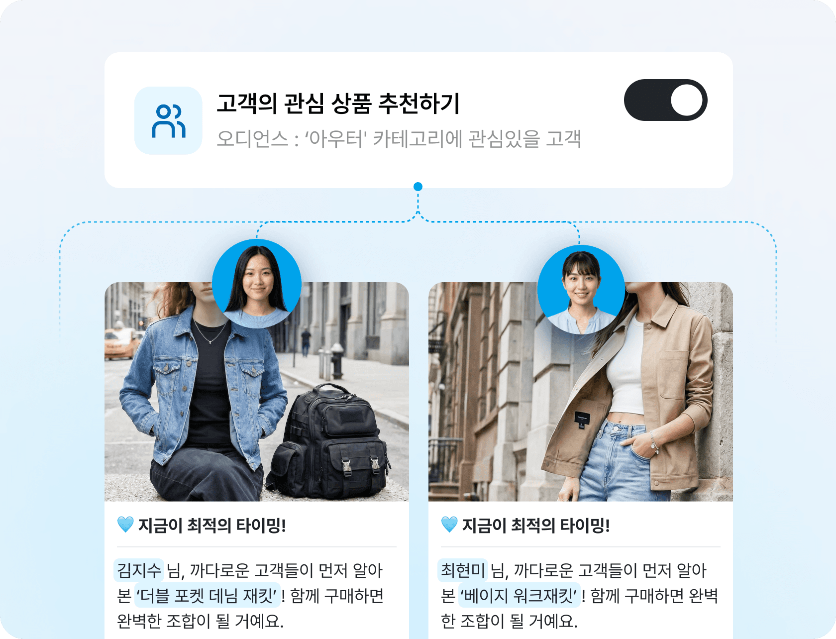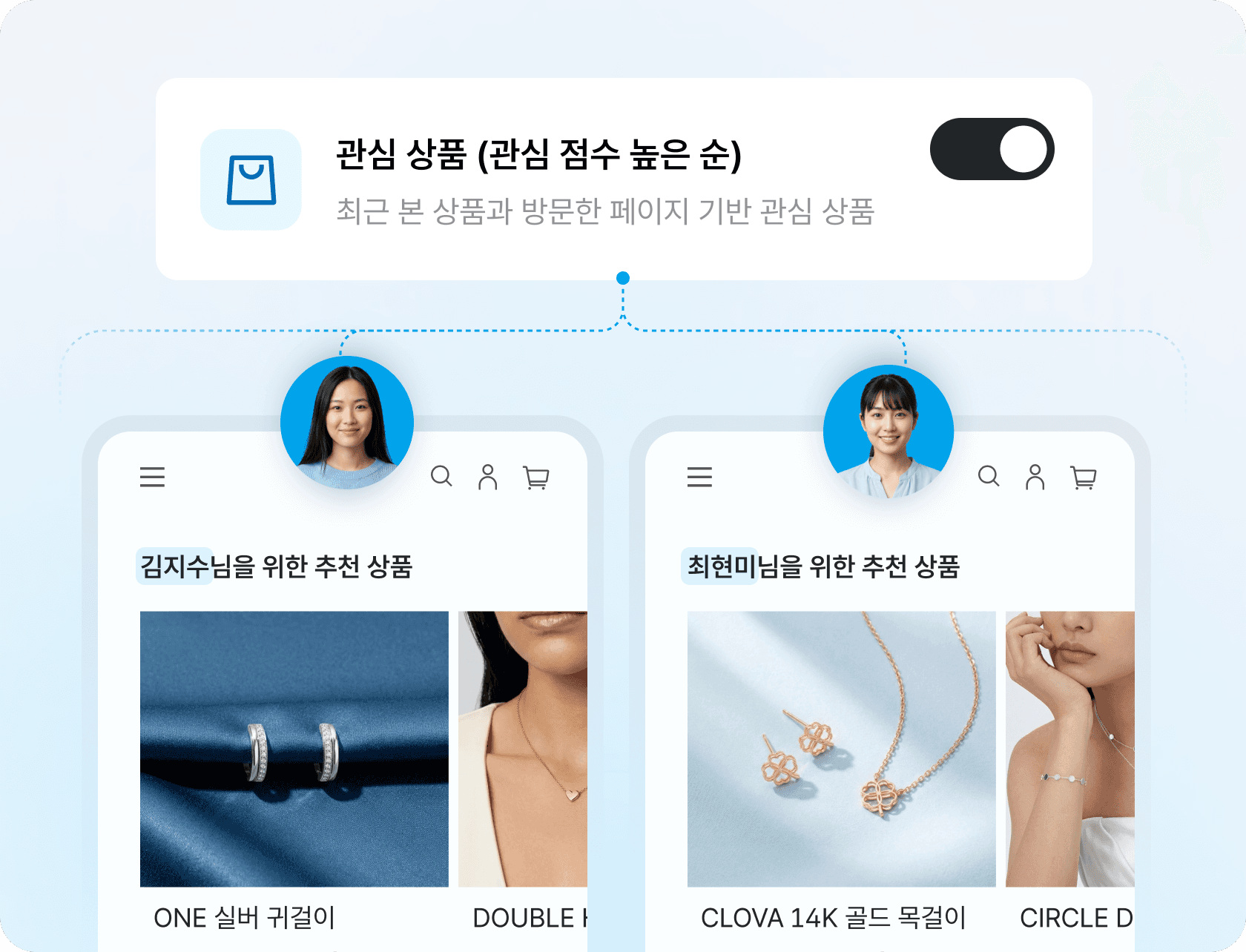 최근 조회한 상품, 함께 구매한 패턴, 관심 카테고리를 실시간으로 반영하기 때문에 수백 가지 경우의 수를 직접 설계하지 않아도 됩니다.