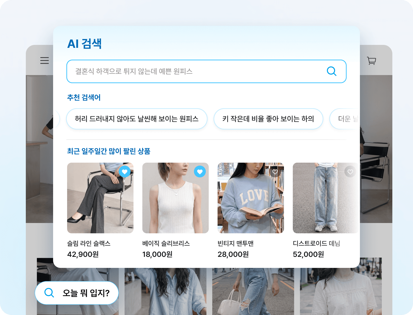 '청바지에 어울리는 상의', '출근룩에 딱인 깔끔한 슬랙스' 처럼 고객이 상품이 아닌, 상황을 입력해도 AI가 의도를 읽어 가장 관련성 높은 상품을 찾아줍니다. 키워드 결과가 맞지 않아 이탈하던 고객을 붙잡고, 검색이 구매로 이어지는 흐름을 만드세요.