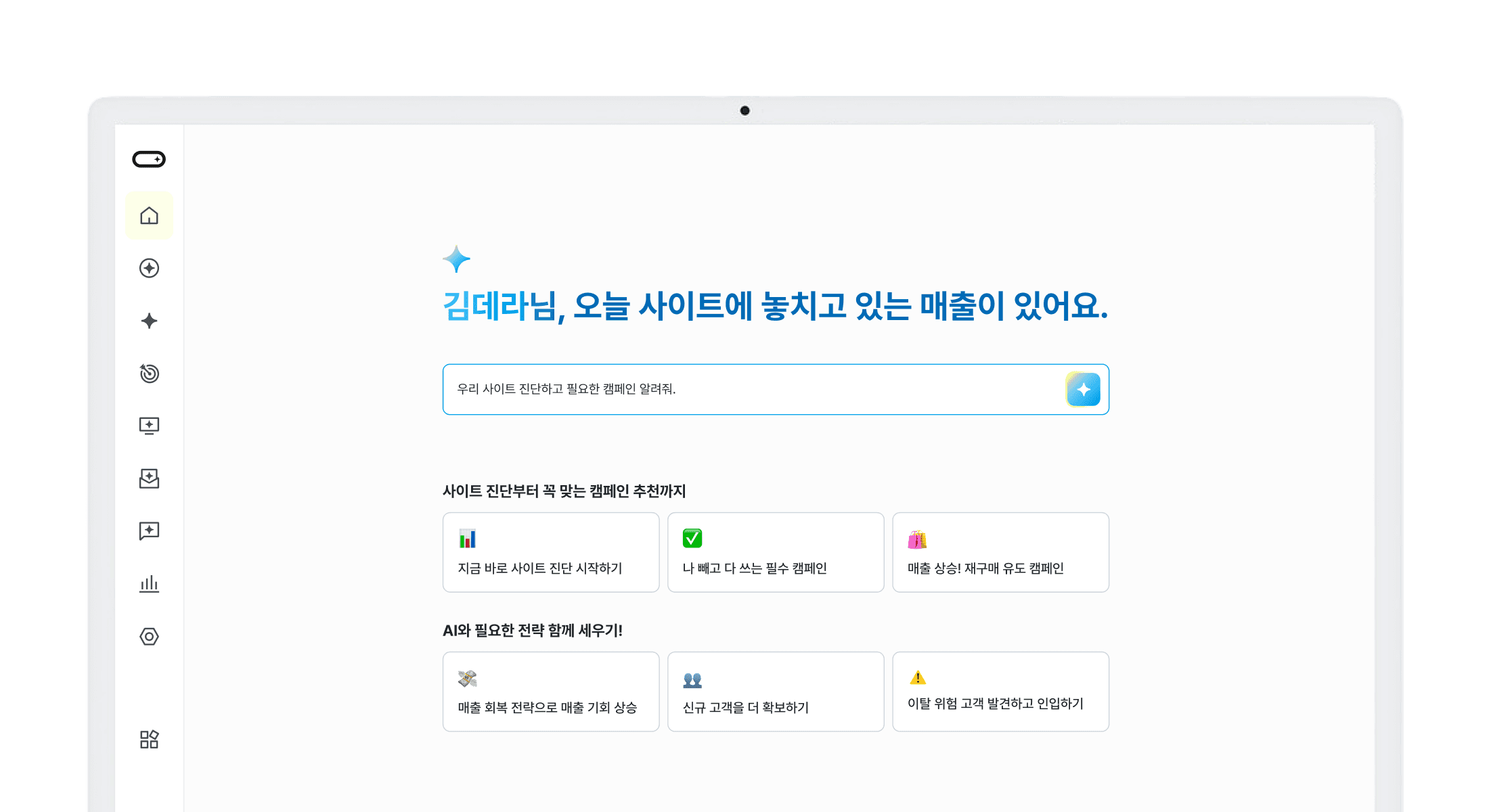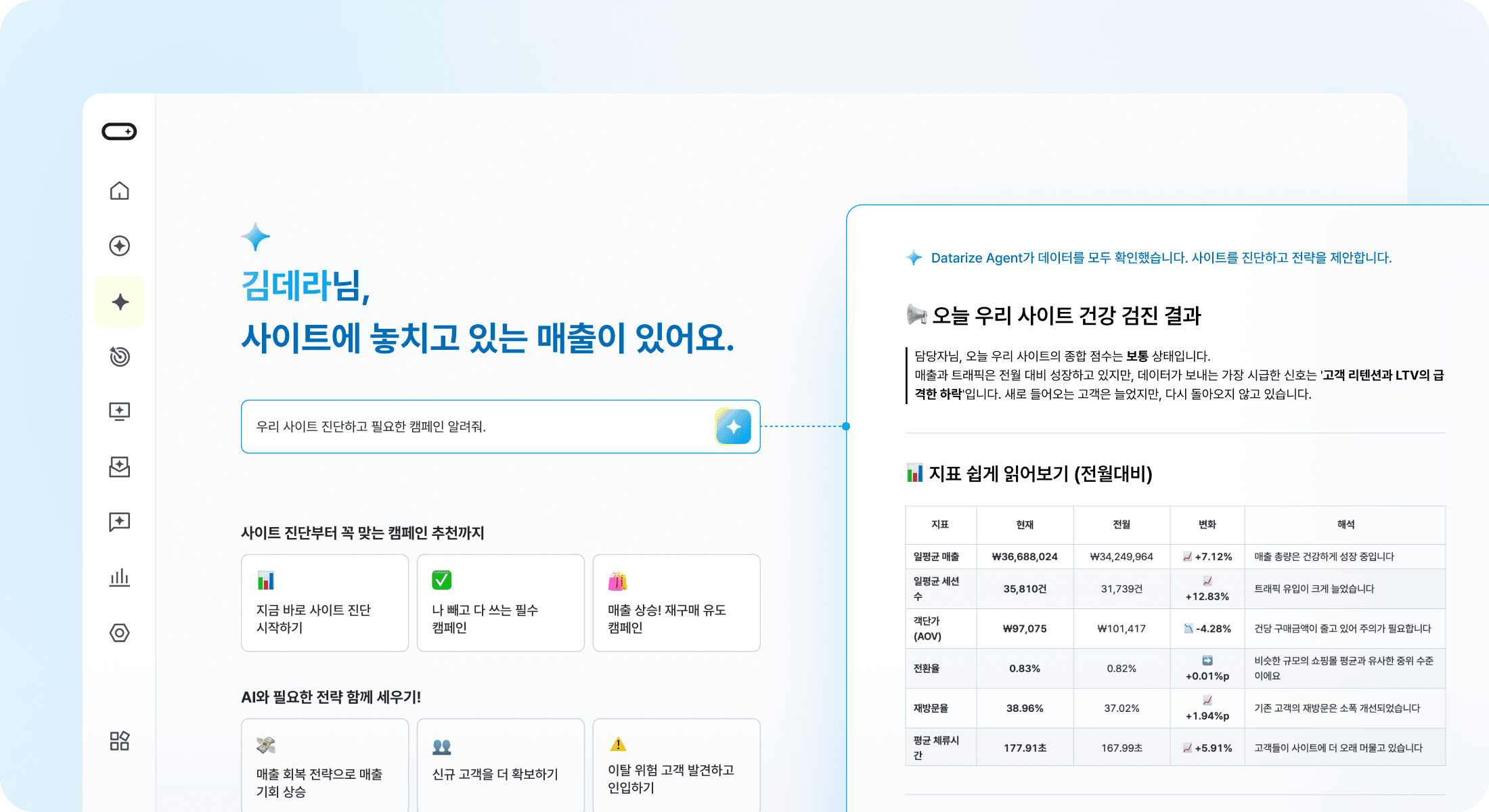 현재 지표를 진단하고, 성과가 낮은 구간을 짚어 어떤 캠페인을 실행해야 하는지까지 제안합니다.