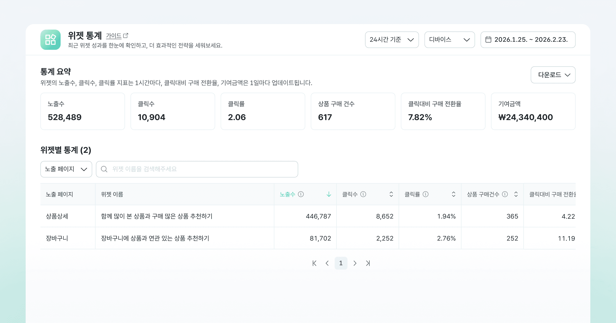 추천 위젯을 통해 노출 → 클릭 → 구매 → 기여 금액까지 추천이 실제 전환에 얼마나 기여했는지 확인할 수 있습니다. 노출·클릭 지표는 1시간 단위로 업데이트되어 위젯 성과를 빠르게 점검하고, 데이터 기반으로 추천 전략을 조정할 수 있습니다.