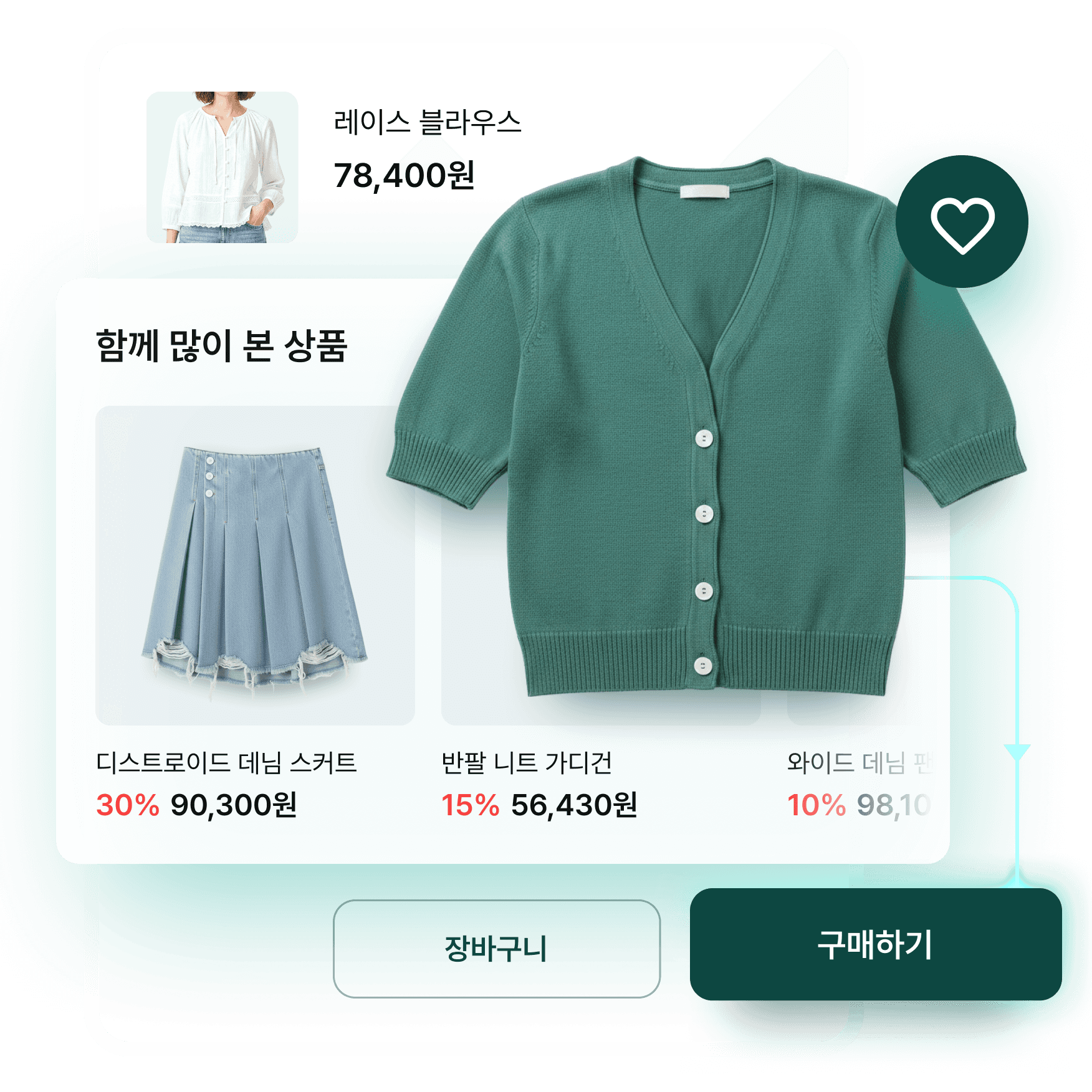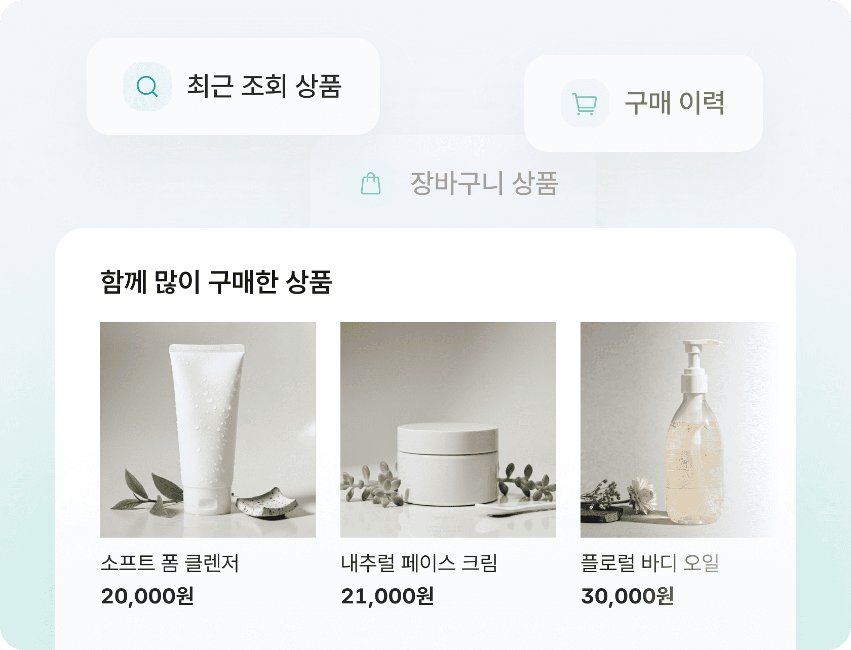 상품을 하나하나 고르지 않아도, 고객의 최근 조회, 장바구니 구성, 구매 이력을 AI가 종합적으로 분석해 고객이 가장 구매할 가능성이 높은 상품을 자동으로 추천합니다.