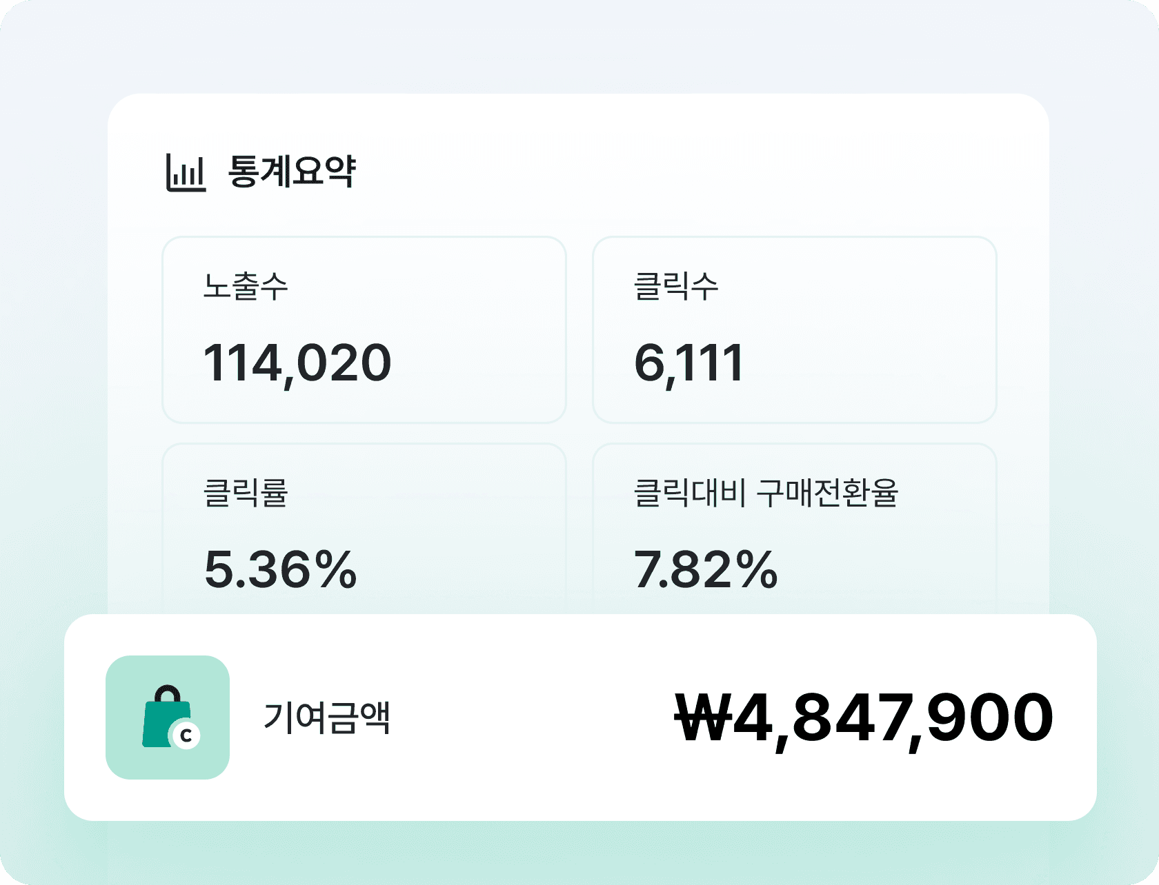 추천 위젯에 노출된 상품이 클릭부터 실제 구매로 어떻게 이어졌는지 한 화면에서 확인할 수 있습니다.
