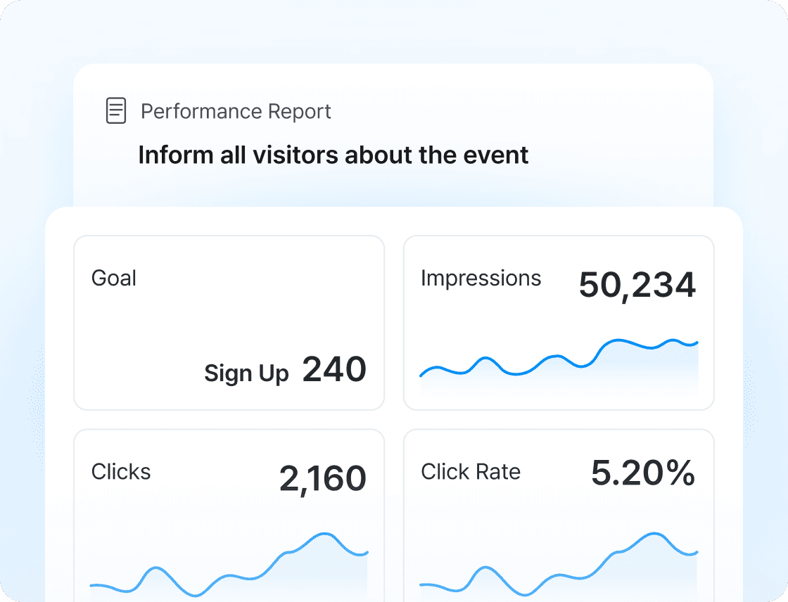 Track everything—impressions, CTR, revenue—on a single page and instantly see which popup banner actually drives growth.