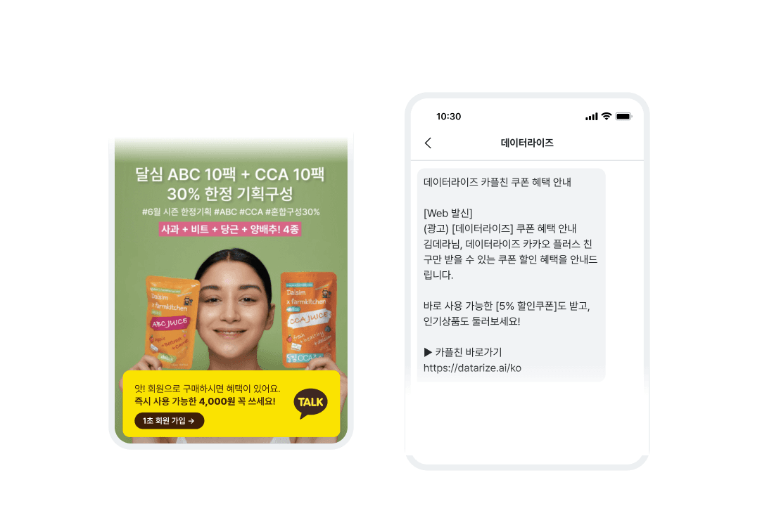 채널 친구 수가 부족한 신규 브랜드라도 온사이트 배너와 LMS(문자 메시지) Failover를 결합하여 일주일 만에 채널 친구 수를 2,210% 증가시킨 실 사례가 있습니다.